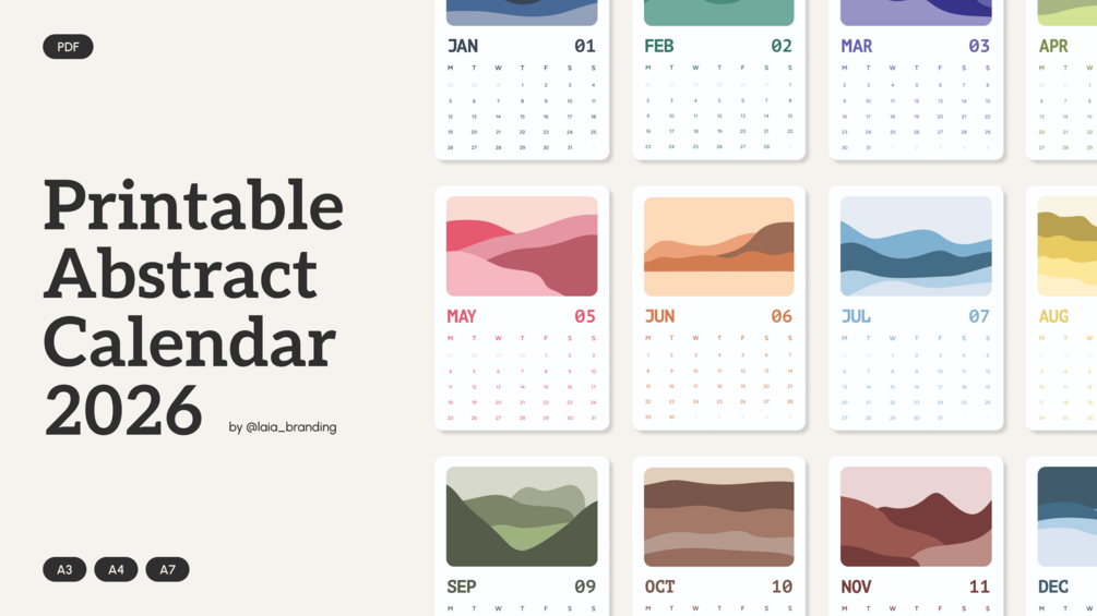 1 cover and 12 monthly pages in different dimensions: A3 (wall poster), A4 (desk calendar), A7 (mini-calendar or pocket cards), and a "print-ready" file (a special PDF in A4 format with the A7 cards grouped, ready to be printed and cut directly).