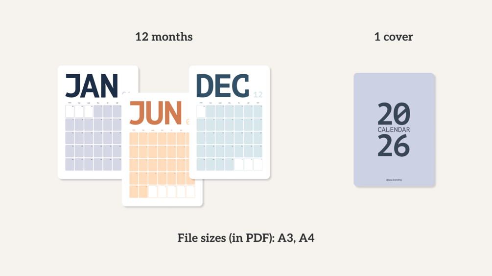 1 cover and 12 monthly pages in different dimensions: A3 (wall poster) and A4 (desk calendar).